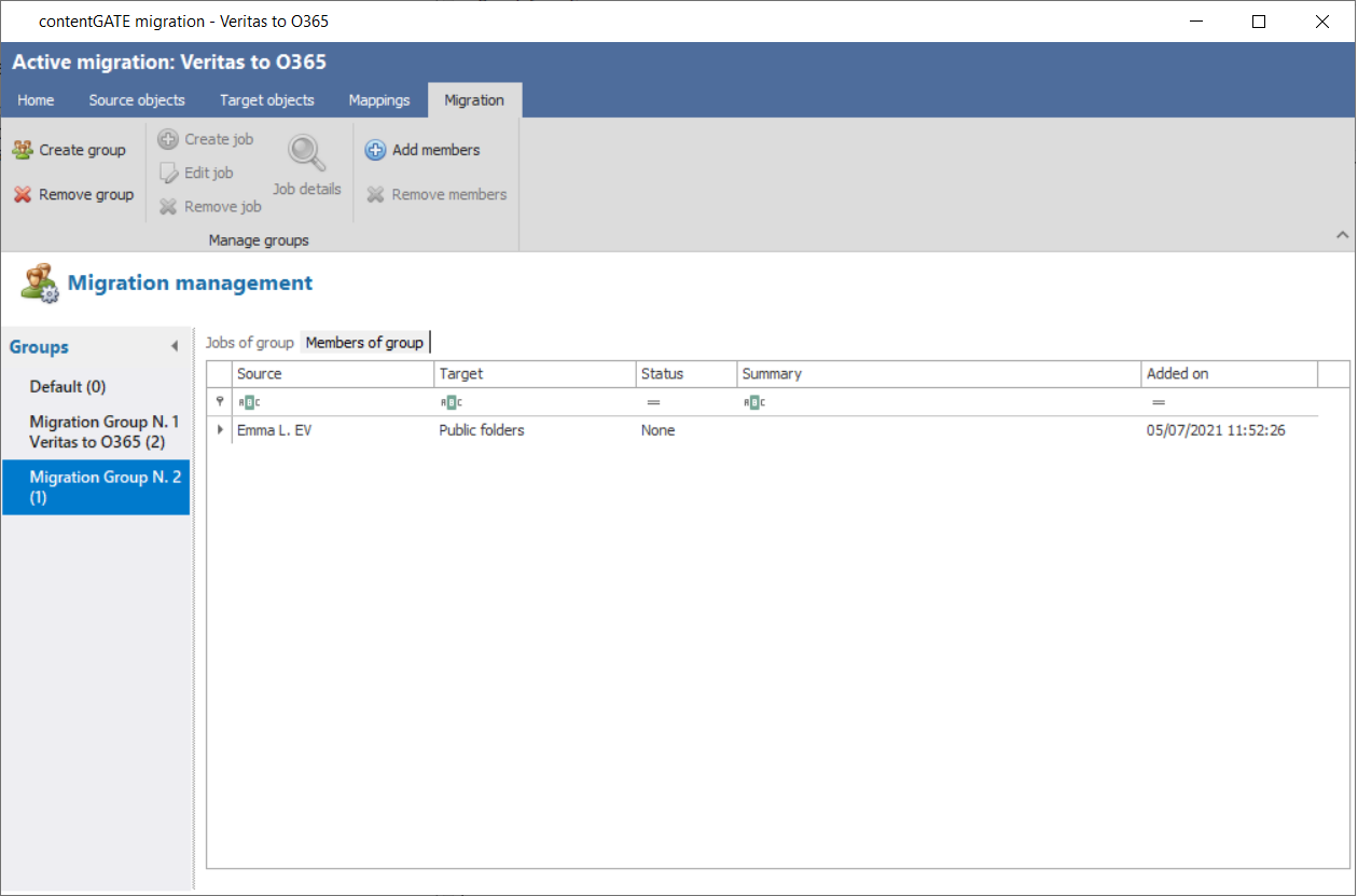 Migration can be started only at a group level. Group management makes the migration process more transparent and clearer. It makes it easier to check, which mailboxes have already been migrated and helps to prioritize important mailboxes.